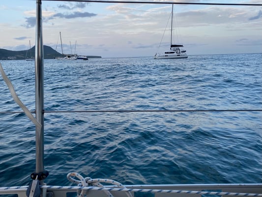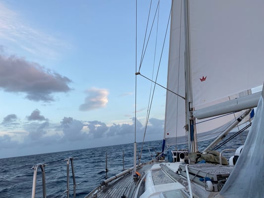 Wir haben viel Wind, in Böen bis zu 30 Knoten. Fliegen in der Spitze mit 9,2 Knoten trotz dem dritten Reff in Groß und Genua dahin. Die karibischen Inseln sind vor allem zu dieser Jahreszeit recht anspruchsvoll zum Segeln: Zwischen den Inseln steigen Wind und Welle merklich an und laufend kommen Squalls (kleine Tiefdruckgebiete), wodurch der Wind plötzlich um 10 Knoten steigt.