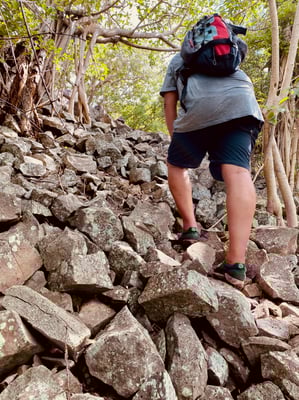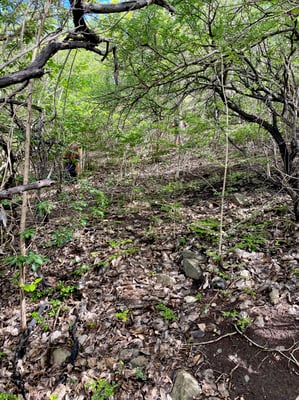 Es ist gar nicht so einfach den Pfad nach oben zu finden und so wandern wir viel querfeld ein. Zudem ist es durch den vielen Regen sehr rutschig. Nach ca. 230 Meter Aufstieg (in Teilen krabbeln