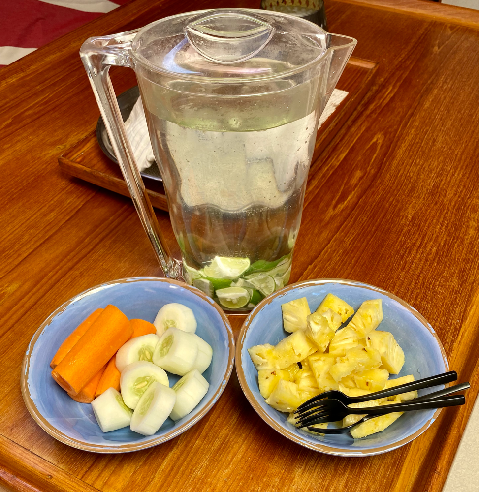 Als Snacks gibt es immer wieder was leckeres, bspw. Ananas, Gurke, Karotte & Limettenwasser. Die hungrige Meute will bei Laune gehalten werden werden.