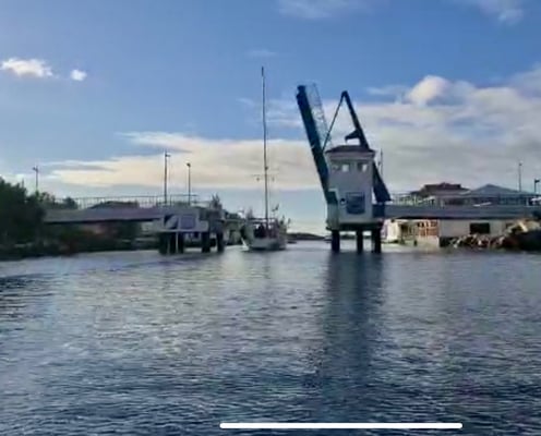 Während dieser rd. 2 Wochen sind die drei Männer gut mit Bootsarbeiten eingedeckt. Leider ist die Rollanlage des Vorsegels nach rd. 20 Jahren kaputt gegangen und wir müssen sie ersetzen lassen. Dafür fahren die drei Jungs mit unserer LEREVE unter einer sehr schmalen Hebebrücke durch in die Lagune.