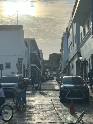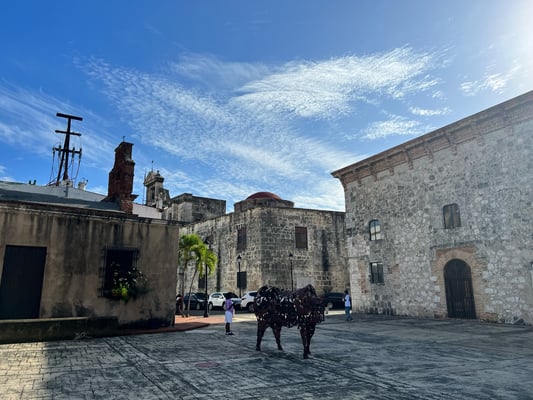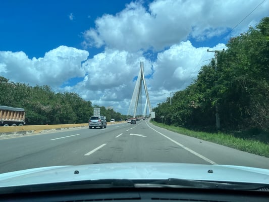 Nach dem erholsamen Tag verlassen wir das Ressort und fahren rd. 2h nach Santo Domingo - in die Hauptstadt. In einem Vorort müssen wir eine Sperrung auf der Autobahn umfahren… Ganz schön abenteuerlich. Nicht mehr gepflastert und riesige Wasserlöcher durch den vielen Regen der letzten Wochen und Monate 🙄. Dieses Viertel scheint von der Behausung das normale Lebensniveau der hiesigen Mittelschicht abzubilden. Kleine Steinhäuser….