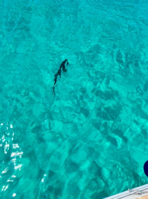 Zuerst fangen sie einen kleinen Raubfisch und diesen nutzen sie dann als Köder. Zwei Zitronenhaie schwimmen um unser Boot und warten auf einen Fang. 😂