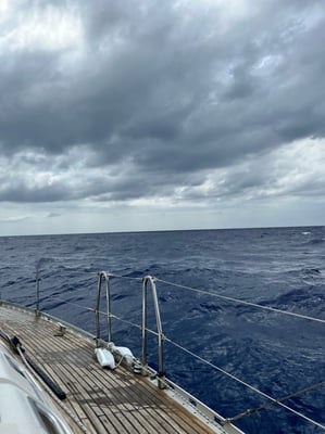 Während der Fahrt versuchen wir das Leichtwindsegel auszurollen. Leider ohne Erfolg, es lässt sich nur teilweise ausrollen. Es scheint an einer Stelle in die andere Richtung gewickelt zu sein. Stundenlang stehen Julian und Matthias am Bug und versuchen das Problem zu lösen… Leider ohne Erfolg.