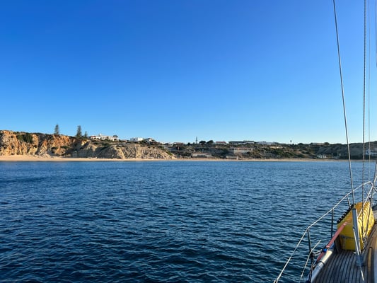 Kurz vor Portugal wird es dann noch mal spannend: Nachmittags müssen wir uns durch ein dichtes Verkehrsgebiet an der portugiesischen Westküste schlängeln - wie Wasserautobahn, die durch uns Fußgänger gequert werden muss. 🙈. Die von oben kommenden Tanker sehen uns (dank AIS 🙏) und machen netterweise langsam - wie wir uns durch den hochkommenden Verkehr schlängeln sollen, wissen wir zunächst noch nicht 😳. Aber auch hier findet sich eine Lücke. Abends kommt wie angekündigt stärkerer Wind mit bis zu 30 Knoten. Aber von schräg hinten. Trotzdem werden es sehr unangenehme letzte 40 Seemeilen (rd. 7 Stunden). Wir bekommen richtig viel Welle über. Um 1.30 Uhr werfen wir den Anker in der portugiesischen Bucht Sagres. Liam schläft schon. Wir übrigen 4 gönnen uns einen Anlegerdrink. 🍻